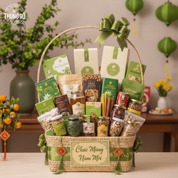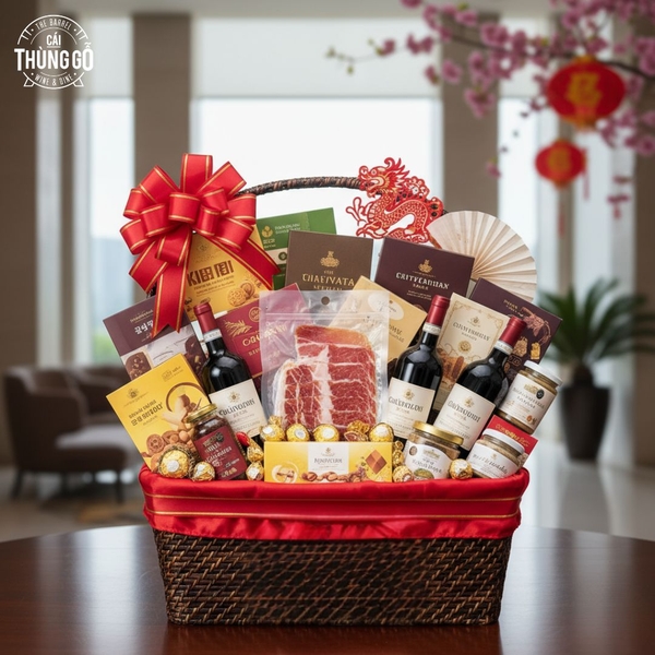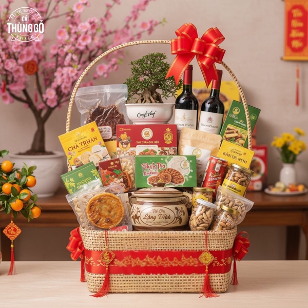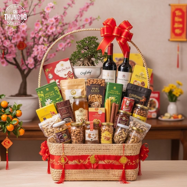 Chuyên nghiệp và Đẳng cấp: Cái Thùng Gỗ chuyên cung cấp các giỏ quà, hộp quà Tết được thiết kế tinh tế, sang trọng với các sản phẩm chọn lọc kỹ lưỡng như rượu vang nhập khẩu, bánh kẹo cao cấp, và các loại hạt dinh dưỡng.