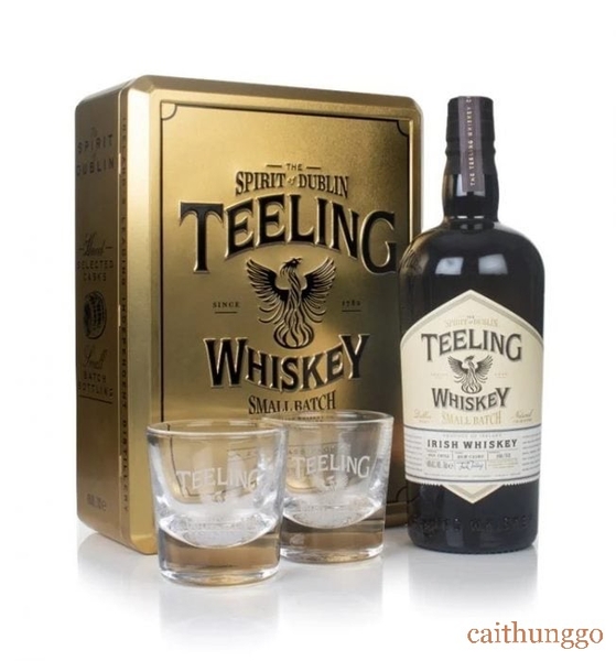 Bộ quà tặng đầy phong cách từ Teeling, Dublin, với chai Small Batch Irish whiskey. Rượu được ủ ban đầu trong thùng ex-bourbon, sau đó hoàn thiện trong thùng rum Trung Mỹ, mang đến hương vị độc đáo. Bộ quà bao gồm hai ly có logo Teeling và hộp thiếc vàng sang trọng.