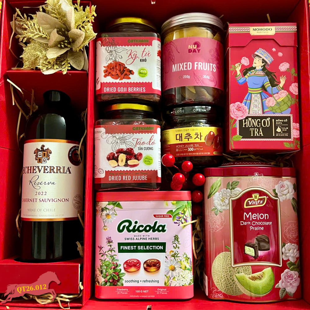 Nếu bạn đang tìm kiếm một hộp quà tết vừa sang trọng, vừa tinh tế để gửi tặng đối tác nữ, sếp nữ hay những người phụ nữ thân yêu, thì Hộp Quà Tết QT26.012 chính là sự lựa chọn hoàn hảo nhất. Với tông màu hồng đỏ chủ đạo tượng trưng cho sự may mắn và hạnh phúc, set quà này là sự kết hợp khéo léo giữa rượu vang đỏ thượng hạng và các loại thảo mộc, thực phẩm tốt cho sức khỏe và sắc đẹp.