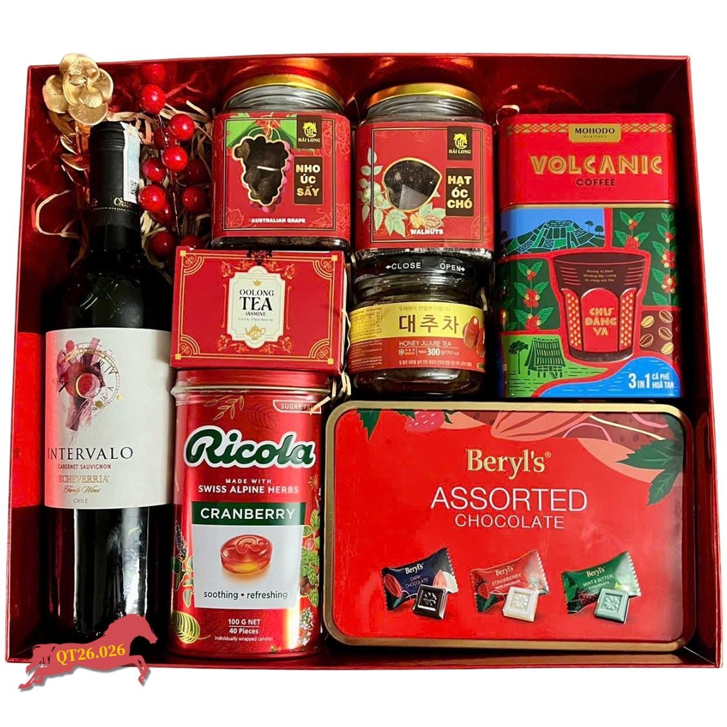 Xu hướng quà tết hiện đại không chỉ chú trọng vào vẻ ngoài sang trọng mà còn đề cao giá trị sức khỏe cho người nhận. Hộp Quà Tết QT26.026 là sự kết hợp tinh tế giữa chai rượu vang đỏ Chile nhập khẩu và các loại hạt dinh dưỡng, trà thảo mộc, kẹo không đường. Đây là mẫu hộp quà tết lý tưởng, thể hiện sự quan tâm sâu sắc của người tặng, rất phù hợp để làm quà tết doanh nghiệp hoặc biếu tặng người cao tuổi, đối tác quan trọng.