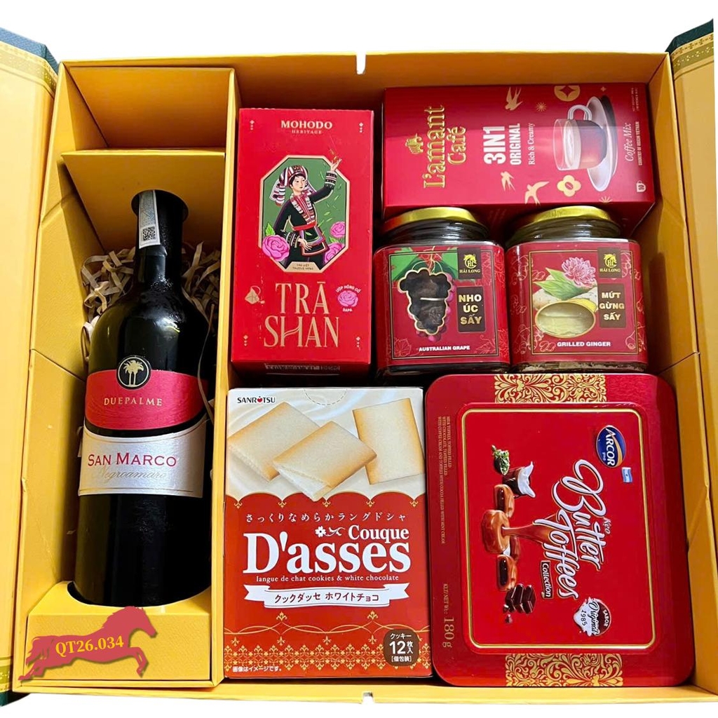 Hộp Quà Tết QT26.034 là sự lựa chọn hoàn hảo cho những ai yêu thích vẻ đẹp truyền thống pha lẫn nét hiện đại. Lấy tông màu đỏ làm chủ đạo với hộp quà Berry 2026, set quà này mang ý nghĩa về sự may mắn, tài lộc. Bên trong là sự kết hợp tinh tế giữa chai rượu vang đỏ Ý nồng nàn và các thức quà bánh, trà, cà phê đậm đà bản sắc Việt cùng bánh kẹo quốc tế. Đây chắc chắn là mẫu hộp quà tết lý tưởng để làm quà tết doanh nghiệp hoặc biếu tặng người thân trong dịp đầu năm mới.