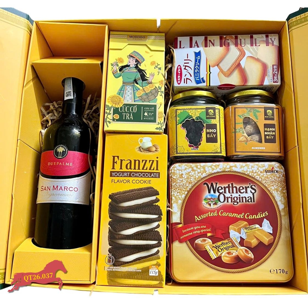 Gửi trao tâm ý trong dịp năm mới với Hộp Quà Tết QT26.037. Đây là sự kết hợp hoàn hảo giữa nét sang trọng, cổ điển của Vang Ý và sự phong phú, ngọt ngào của các loại bánh kẹo nhập khẩu từ nhiều nền văn hóa khác nhau. Một set quà tết doanh nghiệp lý tưởng, vừa trang trọng lại vừa thiết thực.