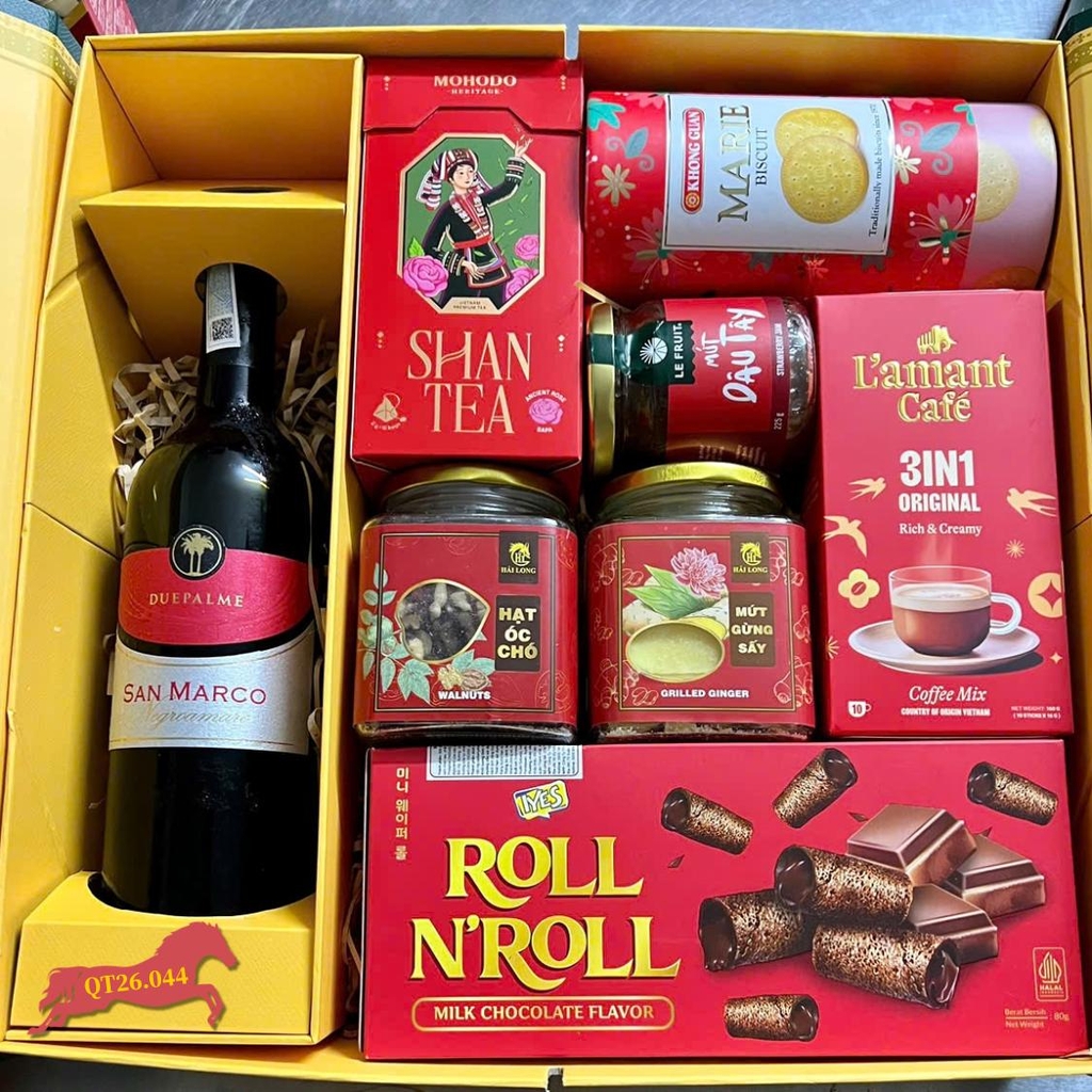 Mùa Tết 2026 này, hãy để Hộp Quà Tết QT26.044 thay bạn gửi gắm những lời chúc tốt đẹp nhất đến đối tác và người thân. Set quà là sự kết hợp hài hòa giữa nét sang trọng của Vang Ý và sự quan tâm tinh tế đến sức khỏe thông qua các loại hạt dinh dưỡng, trà mứt thảo mộc. Đây là mẫu hộp quà tết sang trọng, đầy đặn và ý nghĩa cho dịp đầu năm.