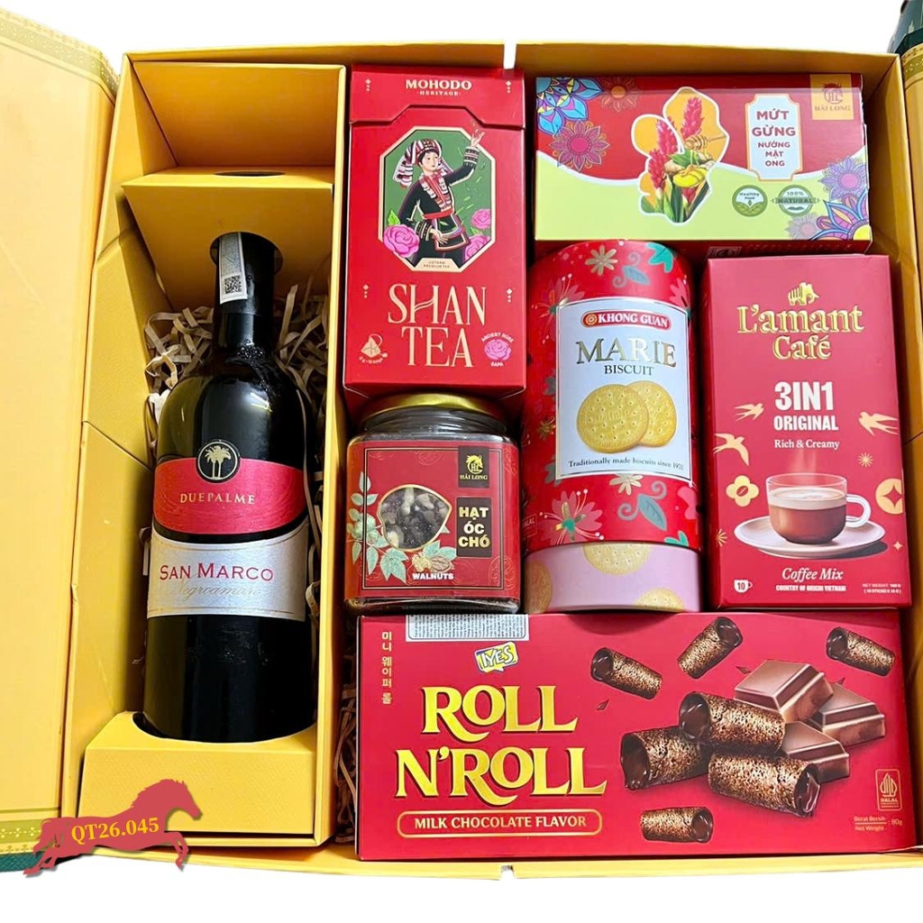 Trong văn hóa Á Đông, màu đỏ tượng trưng cho sự may mắn, hạnh phúc và thịnh vượng. Hộp Quà Tết QT26.045 được thiết kế với tông màu đỏ chủ đạo từ các sản phẩm bánh kẹo cao cấp, kết hợp cùng chai Vang Ý sang trọng, tạo nên một lời chúc "Đắc Tài Đắc Lộc" ý nghĩa dành tặng đối tác và người thân trong dịp Tết 2026.