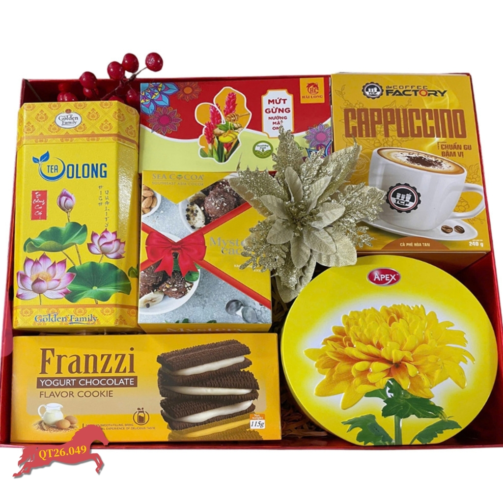Đón chào năm mới 2026 với Hộp Quà Tết QT26.049, một sự lựa chọn hoàn hảo cho những ai yêu thích sự đầy đặn, phong phú và mang đậm không khí lễ hội. Không cần đến rượu mạnh, set quà vẫn chinh phục người nhận bằng những hộp bánh thiết kế rực rỡ mang biểu tượng Tết cổ truyền kết hợp cùng các loại thức uống hảo hạng. Đây là mẫu giỏ quà tết truyền thống lý tưởng để biếu tặng người thân hoặc làm quà tết doanh nghiệp cho nhân viên.