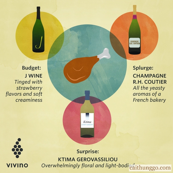 Sự kết hợp giữa lớp da giòn tan và phần thịt ngon ngọt, được tẩm ướp tinh tế tạo nên một hương vị phức hợp. Bí quyết để kết hợp rượu vang hiệu quả nằm ở việc tìm ra một chai rượu vừa tôn lên được phần thịt có hương vị nhẹ nhàng, vừa "cắt" qua được lớp vỏ ngoài béo ngậy và mặn mà. Không có loại rượu nào cân bằng giữa sự đậm đà và thanh lịch tốt như vang sủi, vì vậy không có gì ngạc nhiên khi Champagne thực sự là loại rượu hoàn hảo cho món ăn ngon tuyệt này.