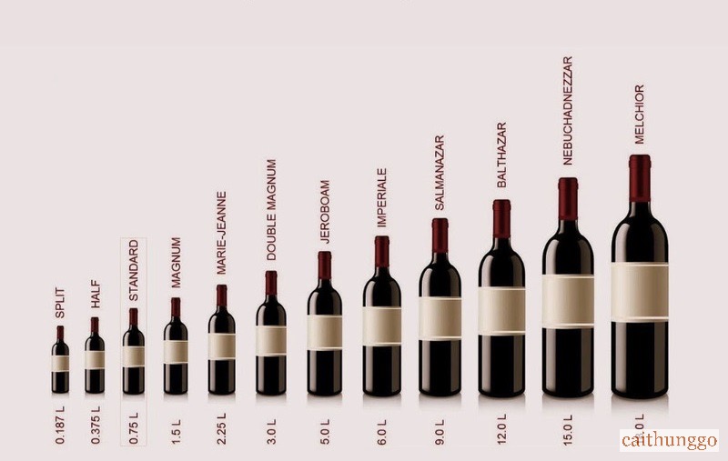 - Magnum: Chai lớn phổ biến nhất chứa 1,5 lít, tương ứng với 12 ly.